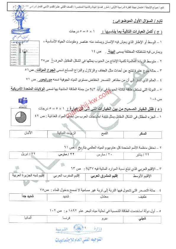 نموذج اجابة اختبار الجغرافيا للصف الثاني عشر الادبي الفترة الدراسية الاولي 2023-2024
