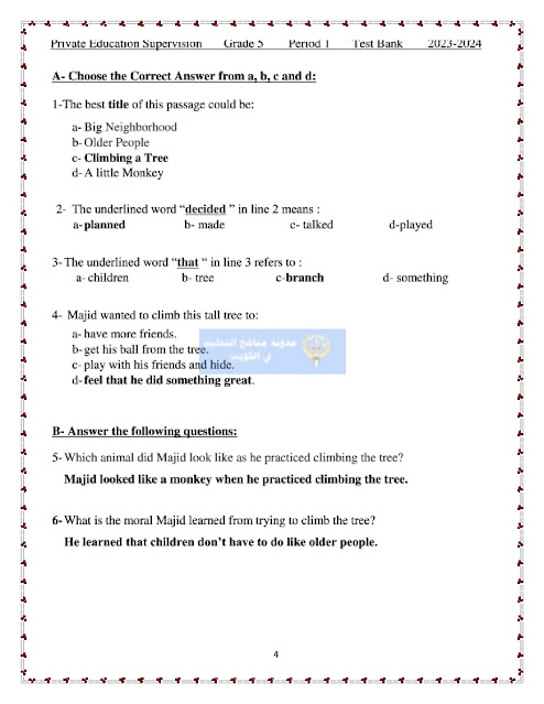 بنك أسئلة شامل مع الحل في اللغة الانجليزية للصف الخامس